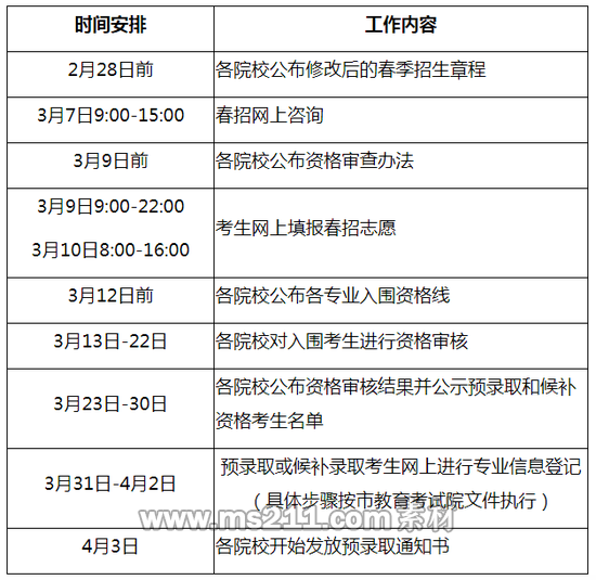 1、2月28日前,各院校公布修改后的春季招生章程。